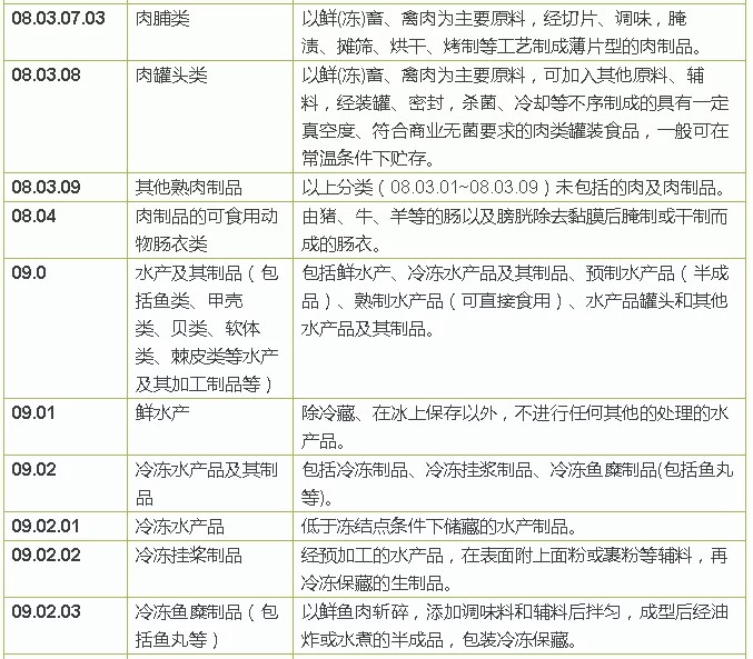 1、食品分類采用《GB 2760-2014 食品安全國家標準 食品添加劑使用標準》中的“食品分類系統(tǒng)”,包含16大類食品。 2、GB 2760-2014中的食品分類除“調(diào)味品、特殊膳食、飲料類、酒類和其它類等類別”之外,大部分是按照“食品主原料”進行分類。因此,在食品生產(chǎn)許可分類中的一些產(chǎn)品類別需要根據(jù)食品的主要原料在“2760食品分類系統(tǒng)”中查找。舉例如下: (1)“餅干”、“糕點”等在“焙烤食品”中查找。 (2)“食糖”、“蜂蜜”在“甜味料”中查找。 (3)“糖果”、“可可及焙烤咖啡”在“可可、巧克力及糖果”中查找。 (4)“罐頭類食品”、“速凍食品”等則需根據(jù)原料來查找。如“畜肉罐頭”和“禽類罐頭”在“肉及肉制品”的“熟肉制品”下;“八寶粥罐頭”則在“糧食及糧食加工品”的“雜糧制品—八寶粥罐頭”下;“蔬菜罐頭”在“水果、蔬菜及其制品”的“蔬菜—加工蔬菜—蔬菜罐頭”下;“水果罐頭”則在“水果、蔬菜及其加工制品”的“水果—加工水果—水果罐頭”下。 |